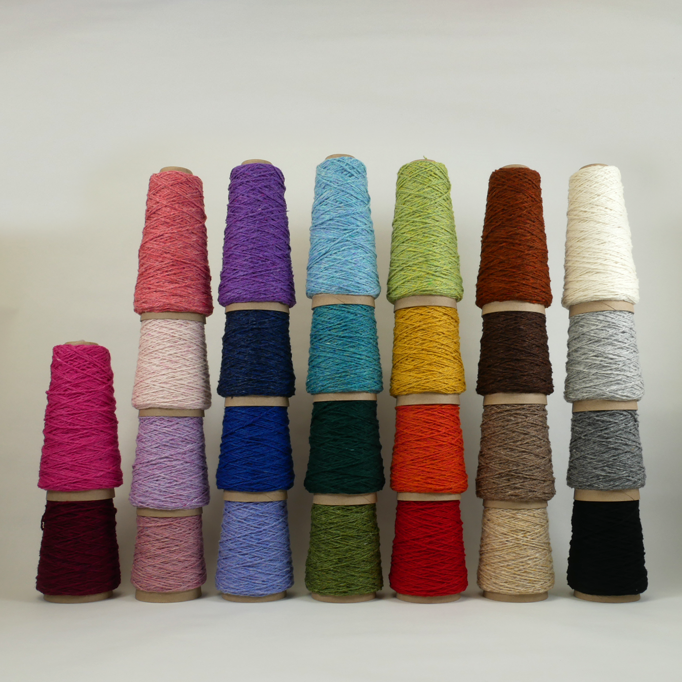 Pure 100% lambswool yarn, in a broad range of melange colours, sold as yarn on cones for machine knitting.