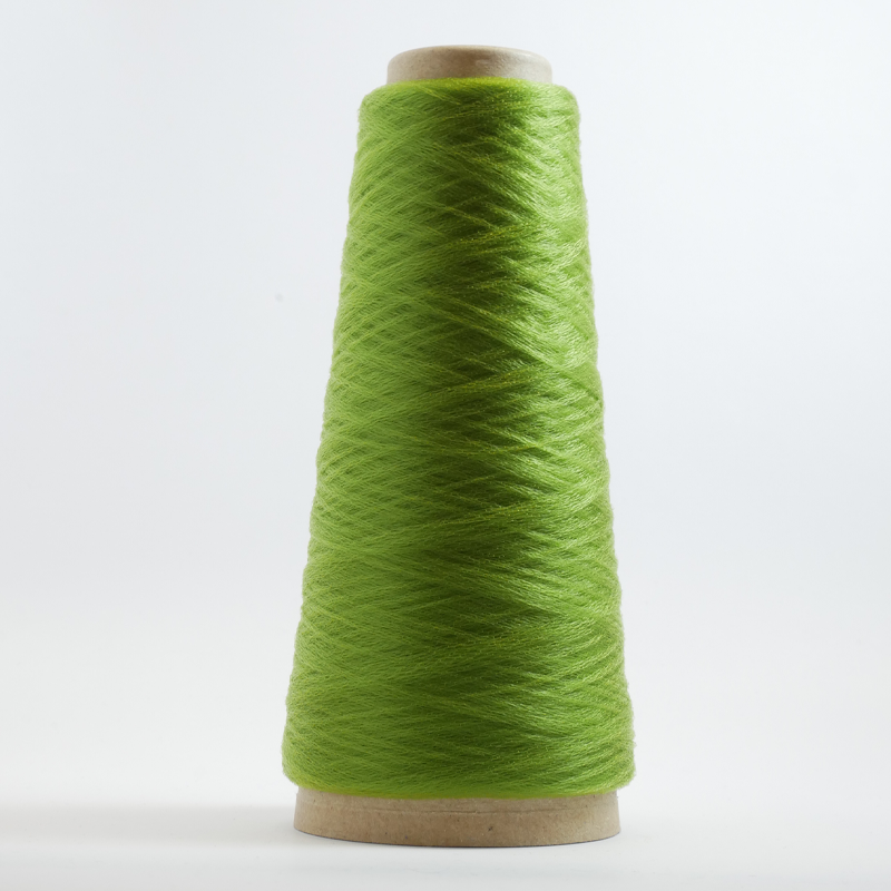 Dyed monofilament chain yarns on cones for machine knitting. This is our Dyed Monofilament Yarn, knitted into a thicker chain format, which you can use on heavier gauge knitting machines.