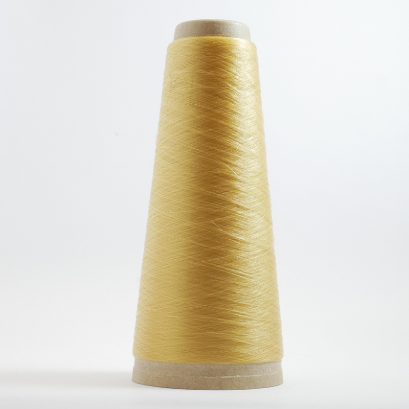 A dyed nylon monofilament yarn, on cones for machine knitting.