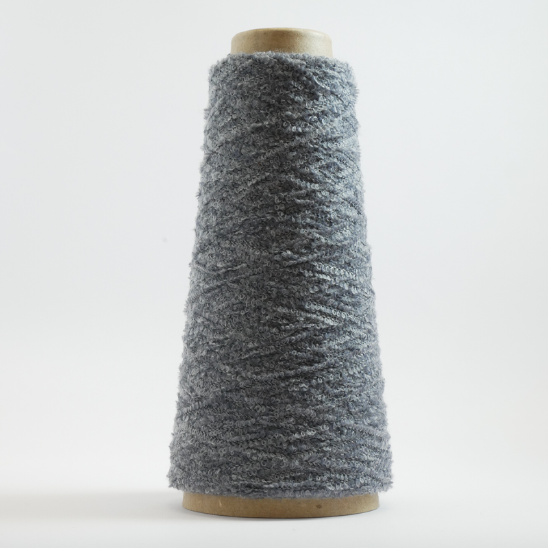 This textured fancy wool yarn, on cones for machine knitting, is structured with a trapped continuous repeating loop of wool around a stable core of polymide.