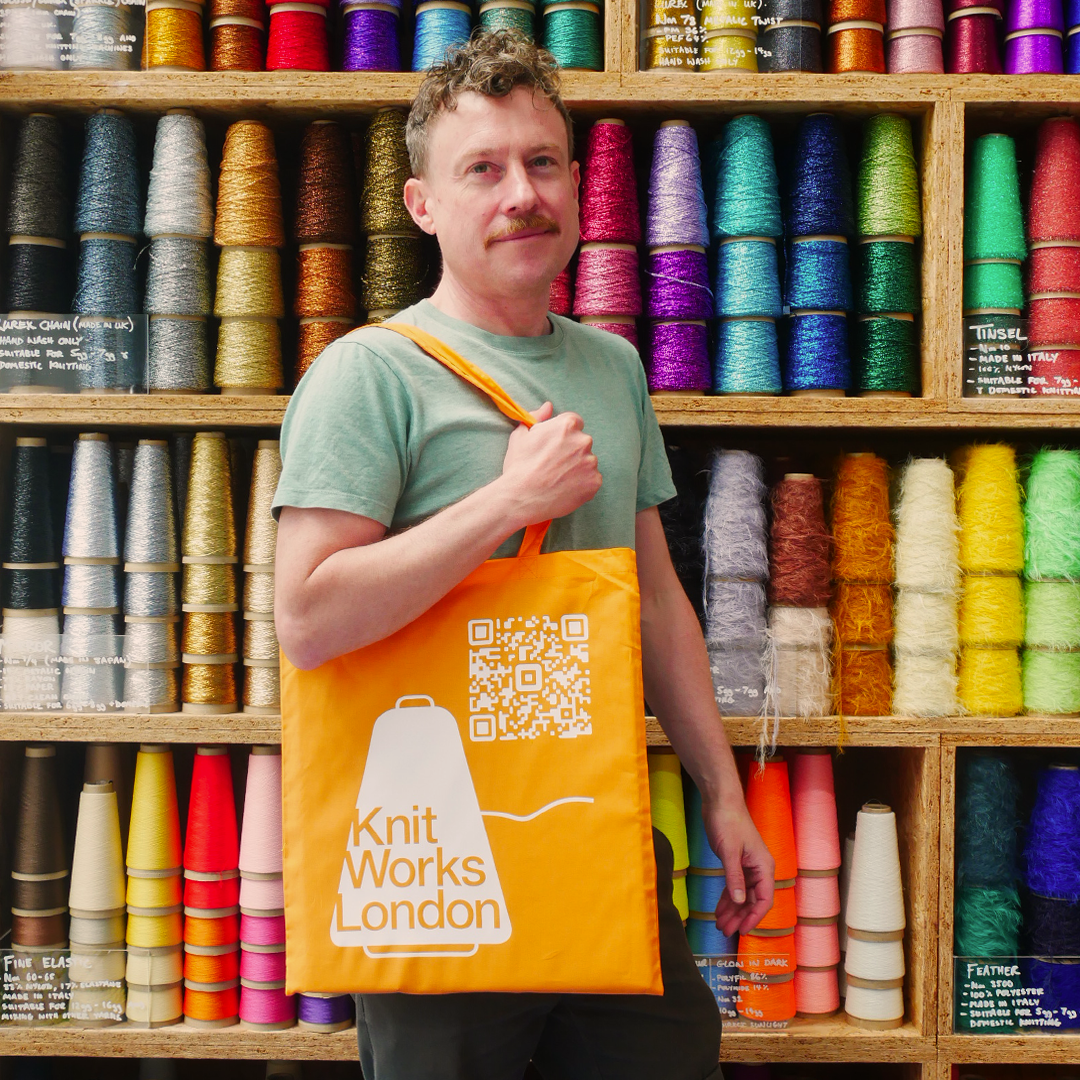 Cotton tote bag with Knit Works Logo and QR code to our website each side.